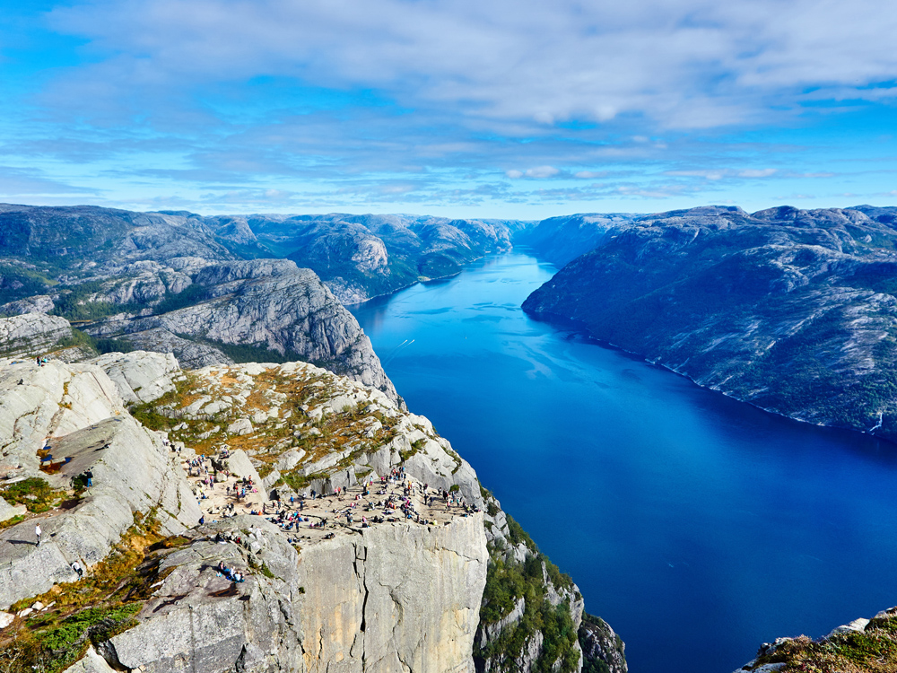 Fotografia z rozległym zapierającym dech w piersiach widokiem na głęboką dolinę fiordu. Plakat jest w morskich niebieskich tonach z oświetlonymi słońcem nagimi skałami po obu stronach fiordu, wspaniały krajobraz, który pasuje na ścianie u osoby, która docenia piękną scenerię przyrody. Uzupełnij obraz ramką do obrazu, która podkreśla motyw.