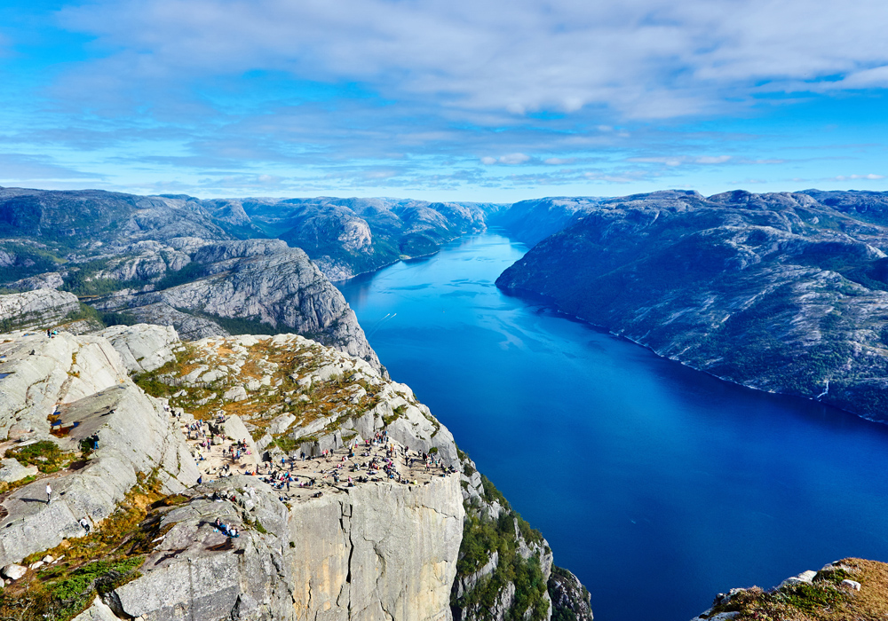 Fotografia z rozległym zapierającym dech w piersiach widokiem na głęboką dolinę fiordową. Plakat ma morskie niebieskie tony z nasłonecznionymi nagimi klifami po obu stronach fiordu, wspaniały krajobraz, który pasuje na ścianę u osoby ceniącej piękne sceny przyrodnicze. Uzupełnij obraz o ramkę, która podkreśli motyw.