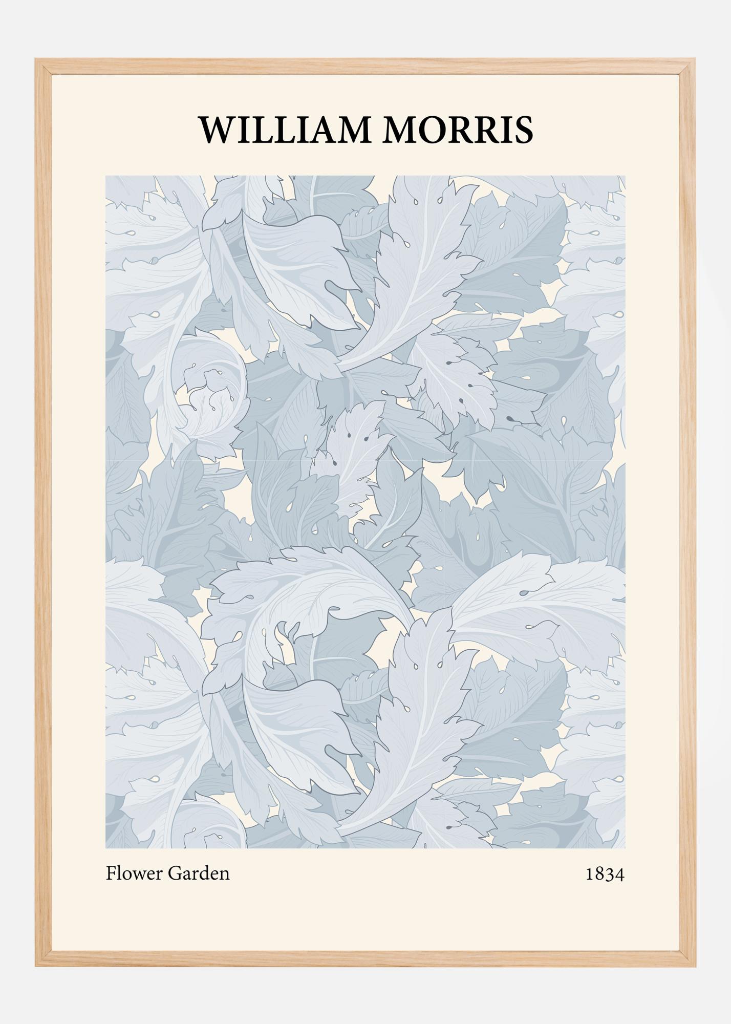 Z atmosferą spokoju i elegancji, ten plakat Williama Morrisa prezentuje symfonię delikatnych liści w chłodnej i kojącej palecie kolorów. "Ogród Kwiatowy" jak sugeruje tytuł, uchwyca istotę bujnego i cichego ogrodu poprzez swój szczegółowy wzór liści, który przepływa po powierzchni z delikatnym rytmem. Paleta kolorów jest starannie dobrana, aby odzwierciedlać subtelne piękno natury i obejmuje niebieski jak niebo, zielony liściowy i blade kremowe kolory, które razem tworzą harmonijną i zrównoważoną estetykę.