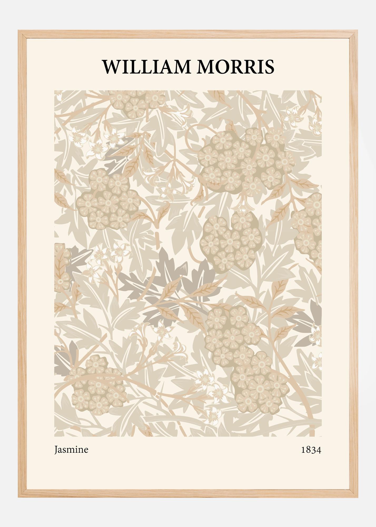 Ten piękny plakat autorstwa Williama Morrisa, zatytułowany "Jasmine", jest hołdem dla klasycznego angielskiego ogrodu, pełnego wonnych kwiatów i bujnej zieleni. Wzór jest gęsto utkany z kwitnących jaśminów i innych kwiatów, otoczonych liśćmi w różnych kształtach i rozmiarach. Paleta kolorów jest miękka i ziemista, z mieszanką neutralnych beży i brązowych tonów na ciepłym kremowym tle, co tworzy poczucie spokoju i harmonii w domu.