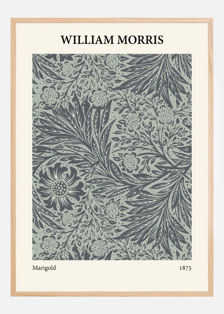 Ten plakat Williama Morrisa, z jego czarującym wzorem "Marigold" z 1875 roku, pokazuje unikalną zdolność Morrisa do tworzenia szczegółowych i harmonijnych ilustracji botanicznych. Motyw jest pełen życia i ruchu, z wijącymi się liśćmi i kwiatami, które zdają się wyrastać z samego papieru. Kolory, w uspokajających tonach zieleni i ciemniejszych akcentach, tworzą eleganckie, a zarazem realistyczne wrażenie.