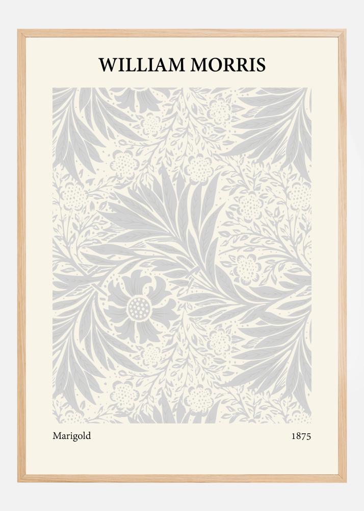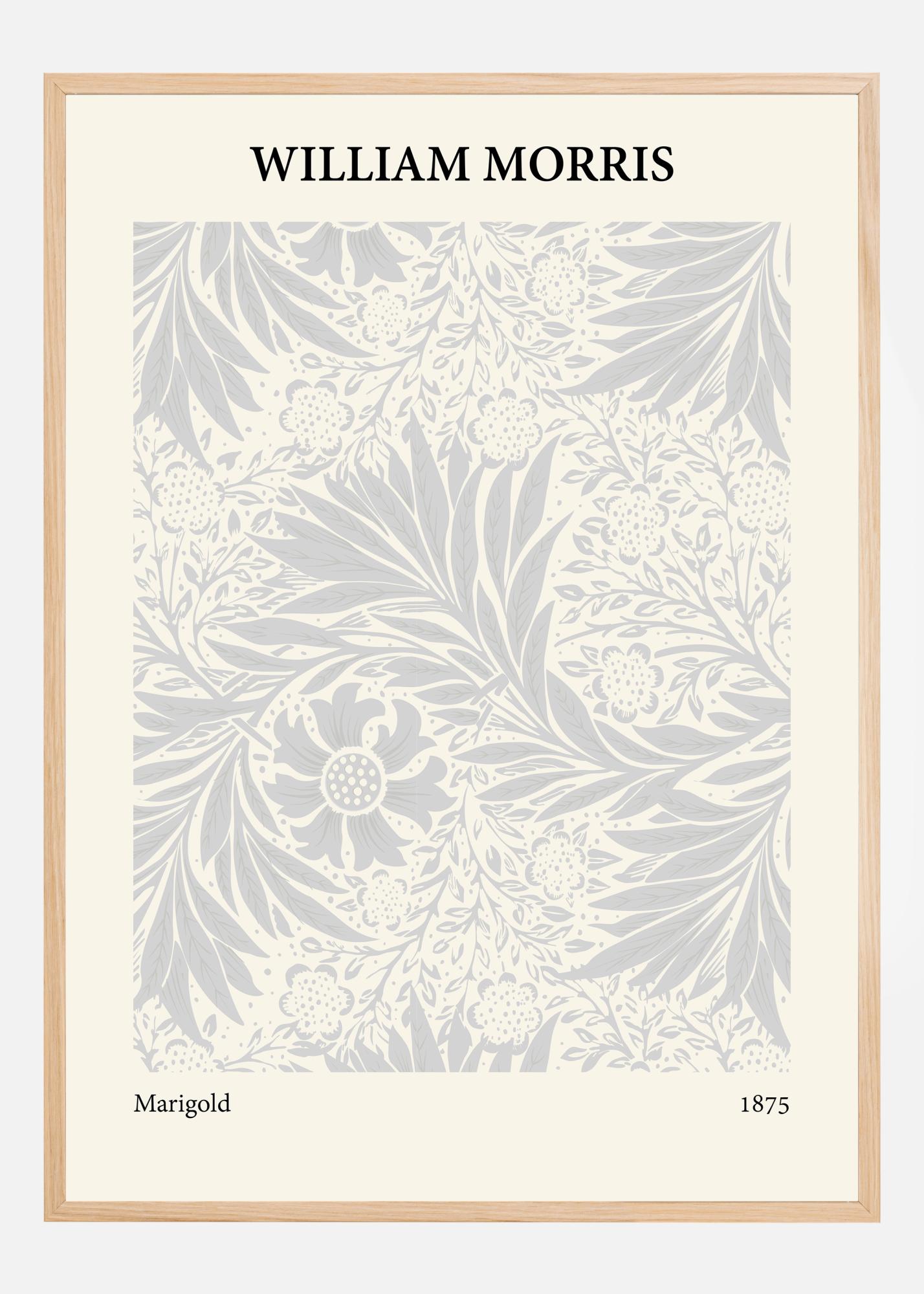 Ten plakat to eleganckie przedstawienie dzieła Williama Morrisa "Nagietek" z 1875 roku, przywołujące poczucie spokoju i naturalnego piękna. Projekt jest wypełniony kwitnącymi nagietkami i delikatnym listowiem, starannie rozmieszczonym w symetrycznym i atrakcyjnym wzorze. Subtelne połączenie kolorów bladych szarości i bieli tworzy miękką i zachęcającą estetykę charakterystyczną dla pracy Morrisa.
