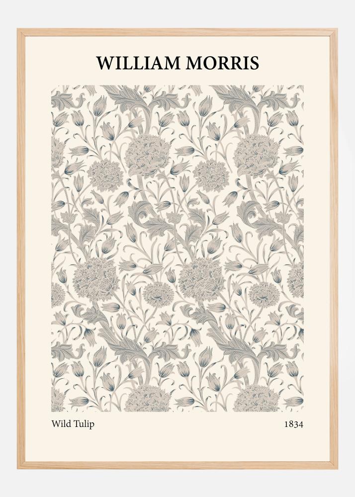 Ten plakat Williama Morrisa, zatytułowany "Wild Tulip", to elegancka interpretacja dzikich kwiatów, stworzona z wielką biegłością i troską. Wzór jest labiryntem tulipanów i liści, wykonanym w subtelnych odcieniach beżu i szarości na ciepłym, kremowym tle, co czyni go idealnym dziełem dla tych, którzy chcą stworzyć relaksujące i wyrafinowane otoczenie. Szczegółowość ilustracji demonstruje mistrzowską rękę Morrisa i jego zdolność do przekształcania codziennych widoków w sztukę.