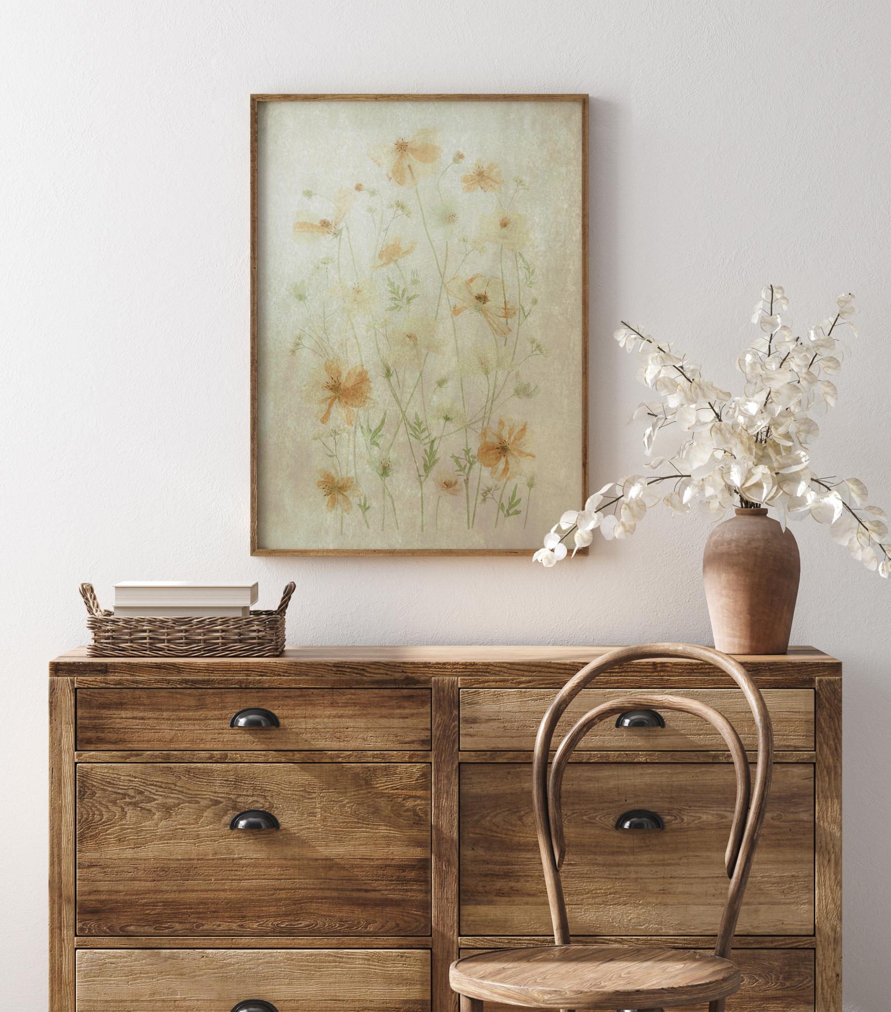 Elegancki plakat z delikatnymi pomarańczowymi kwiatami i zielonymi liśćmi na białym tle. Efekt akwareli sprawia, że każda z tych roślin wygląda delikatnie i krucho. Mimo to, w tej delikatnej, kwiatowej ilustracji znajdują się wspaniałe detale. Zamień swój dom w ogród Edenu, przynosząc do niego ten kwiatowy nadruk.