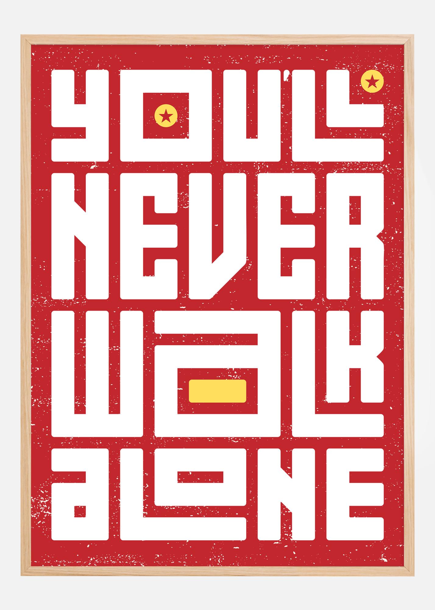 Ten energiczny i podnoszący na duchu plakat emanuje silną obecnością dzięki swojej śmiałej, blokowej typografii podkreślającej przesłanie "You'll Never Walk Alone" w lśniących białych literach na mocnym czerwonem tle. Duże litery są starannie rozmieszczone, aby zmaksymalizować ich efekt wizualny i są ozdobione złotymi gwiazdami oraz prostokątną formą, która przełamuje blok tekstu, dodając dodatkowy wymiar projektowi.