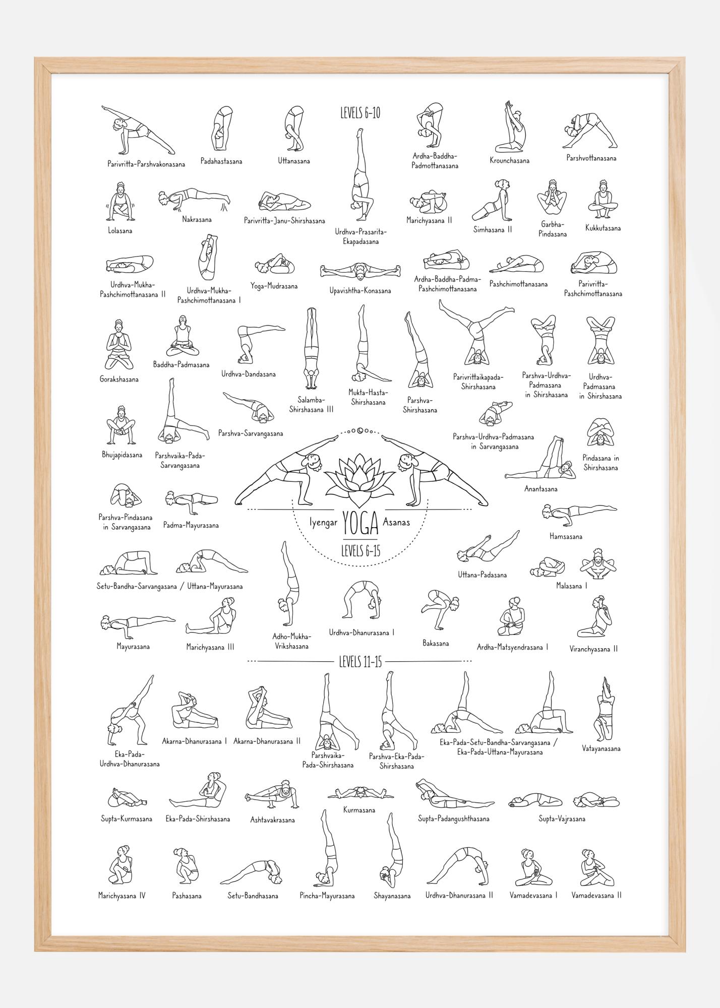 Ten obszerny i pouczający plakat oferuje wizualny przewodnik po pozycjach Iyengar Jogi dla poziomów od 6 do 15, przedstawiony w przejrzystym i metodycznym układzie. Szczegółowe ilustracje są wykonane z precyzyjnymi liniami, które podkreślają unikalne kształty i pozycje każdej asany. Nad każdym obrazkiem znajduje się nazwa asany w sanskrycie, co ułatwia praktykującym na wszystkich poziomach identyfikację i praktykowanie każdej pozycji.