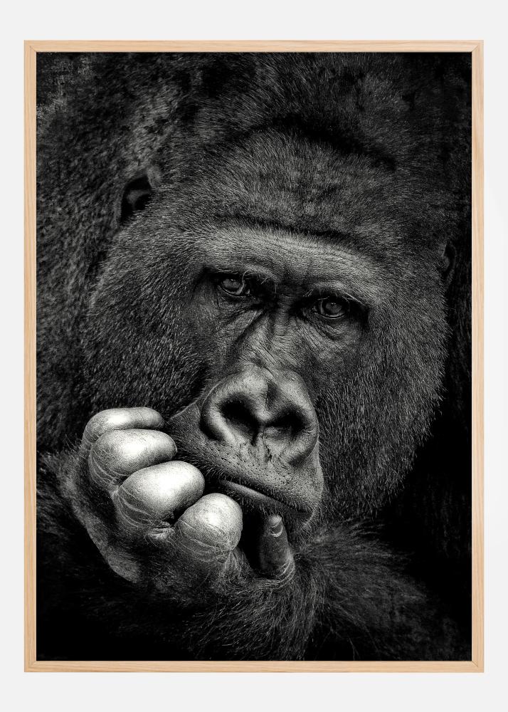 Fantastyczny portretowy plakat z gorylem w zamyślonej pozie. Goryl patrzy na kamerę z rozproszonym wzrokiem. Jedna ręka jest zgięta pod brodą, jakby zastanawiał się nad ważnymi kwestiami. Czarnobiały wydruk uwydatnia wszystkie szczegóły twarzy tego niesamowitego człekokształtnego.