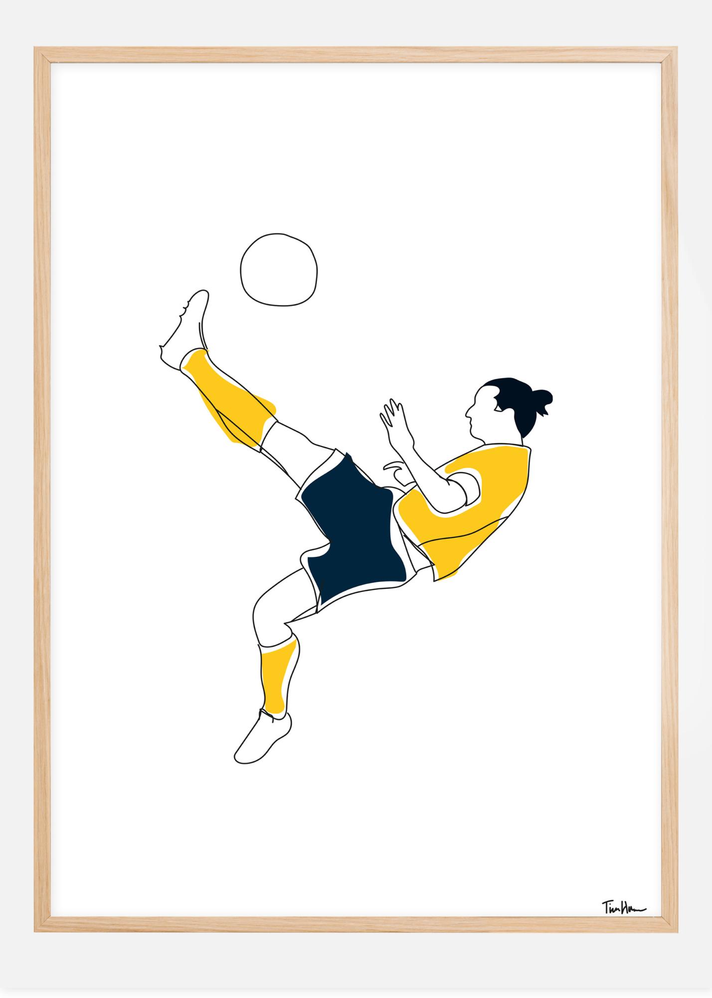 Plakat piłkarski z stylizowanym wizerunkiem Zlatana Ibrahimovicia kopiącego piłkę nożną. Gracz ma na sobie żółtą koszulkę oraz skarpety z granatowymi szortami. Pochyla się do tyłu i kopie nogą wysoko w powietrzu, gdzie piłka nożna unosi się. Świętuj swoją miłość do piłki nożnej z tym prostym, ale skutecznym wzornictwem.