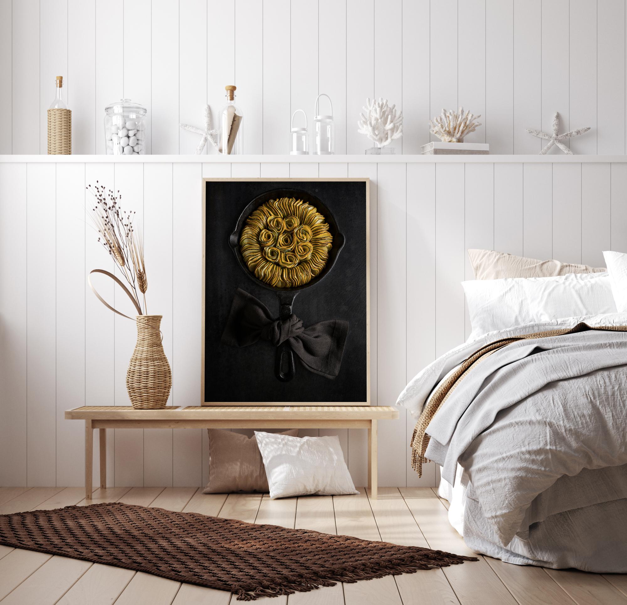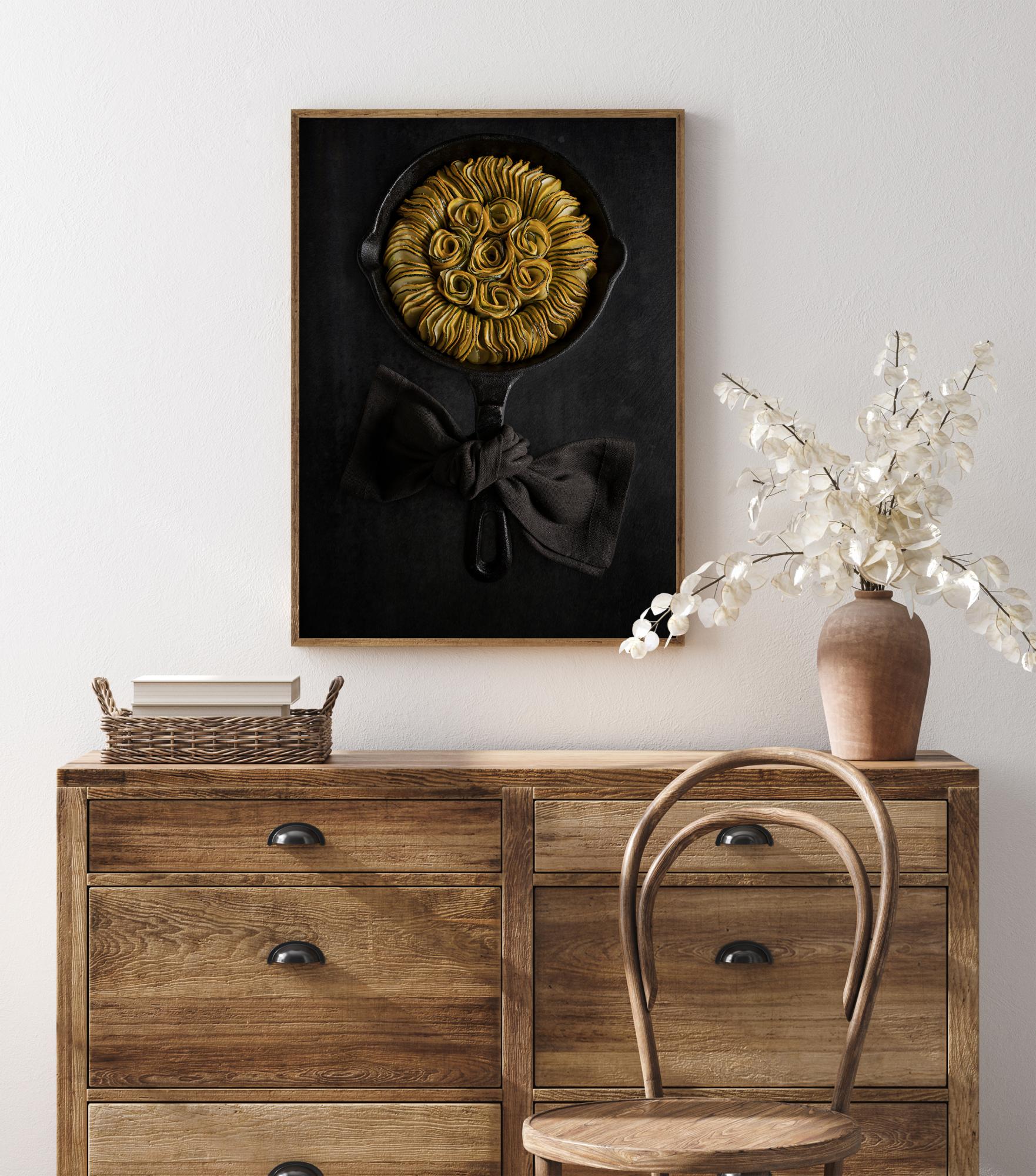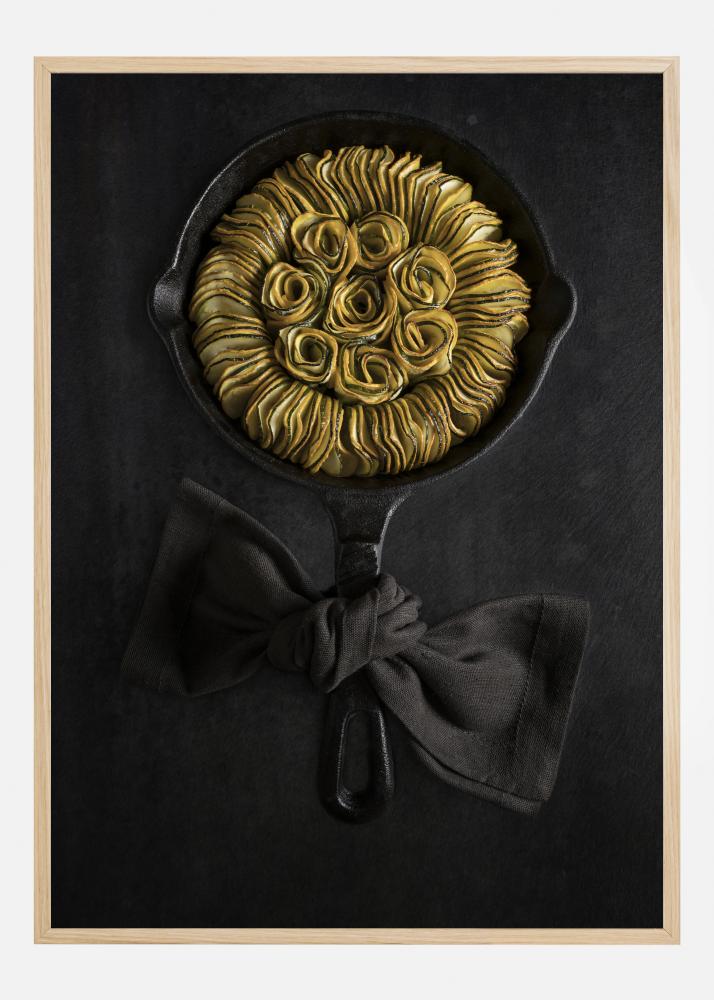 Smaczny plakat z ratatouille z cukinią lub kabaczkiem elegancko ułożonymi w żeliwnej patelni, tworząc wspaniały kształt słonecznika. Żółte i zielone cukinie wyróżniają się na tle czarnej patelni z tkaniną zawiązaną wokół uchwytu. Powieś go w swojej kuchni i zobacz, czy uda ci się zrobić to kuszące danie.